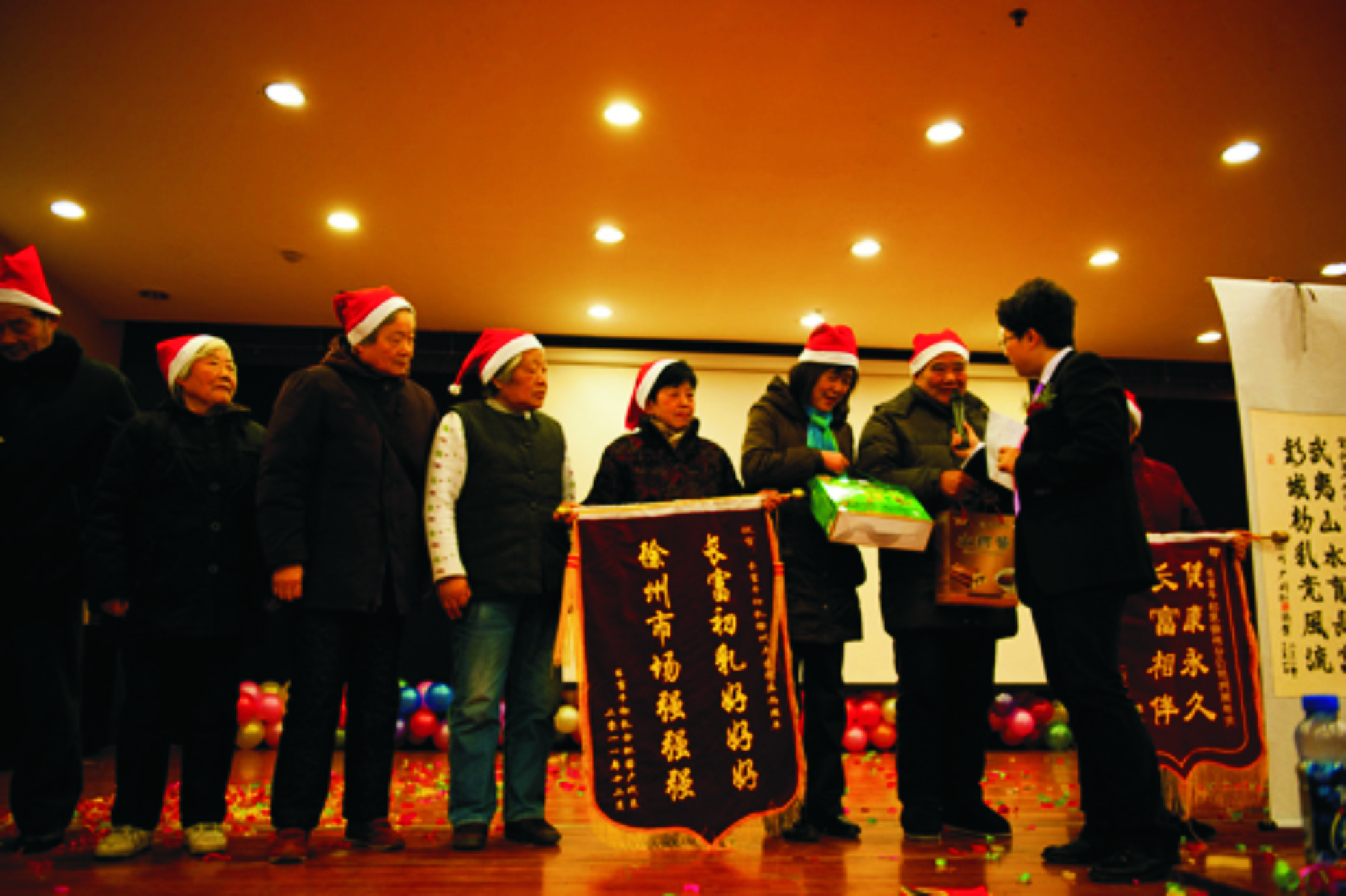 在活动中,长富牛牌牛初乳的受益者们用自己的亲身感受和精彩的节目向我们展示了他们的风采。其中来自徐州当地的受益者,一个曾经参加过中央电视台星光大道的“雪梅组合”,将活动的氛围推向了高潮。这是一群平均年龄已经超过六十岁的阿姨们,不论是蹦跳,劈叉,翻滚,还是叠人墙,她们都像专业演员一样始终以灿烂的笑容完美呈现,现场的掌声久久不能平息;现场来自南京的顾客赠上锦旗,感慨自己在服用长富牛初乳后的惊人变化;来自南京金陵老年大学的书法教授等更是送上亲笔为我们本次周年庆而作的书画,他们的精神深深的感染在场的所有嘉宾,让我们一起去享受了老有所养、老有所乐的美好。